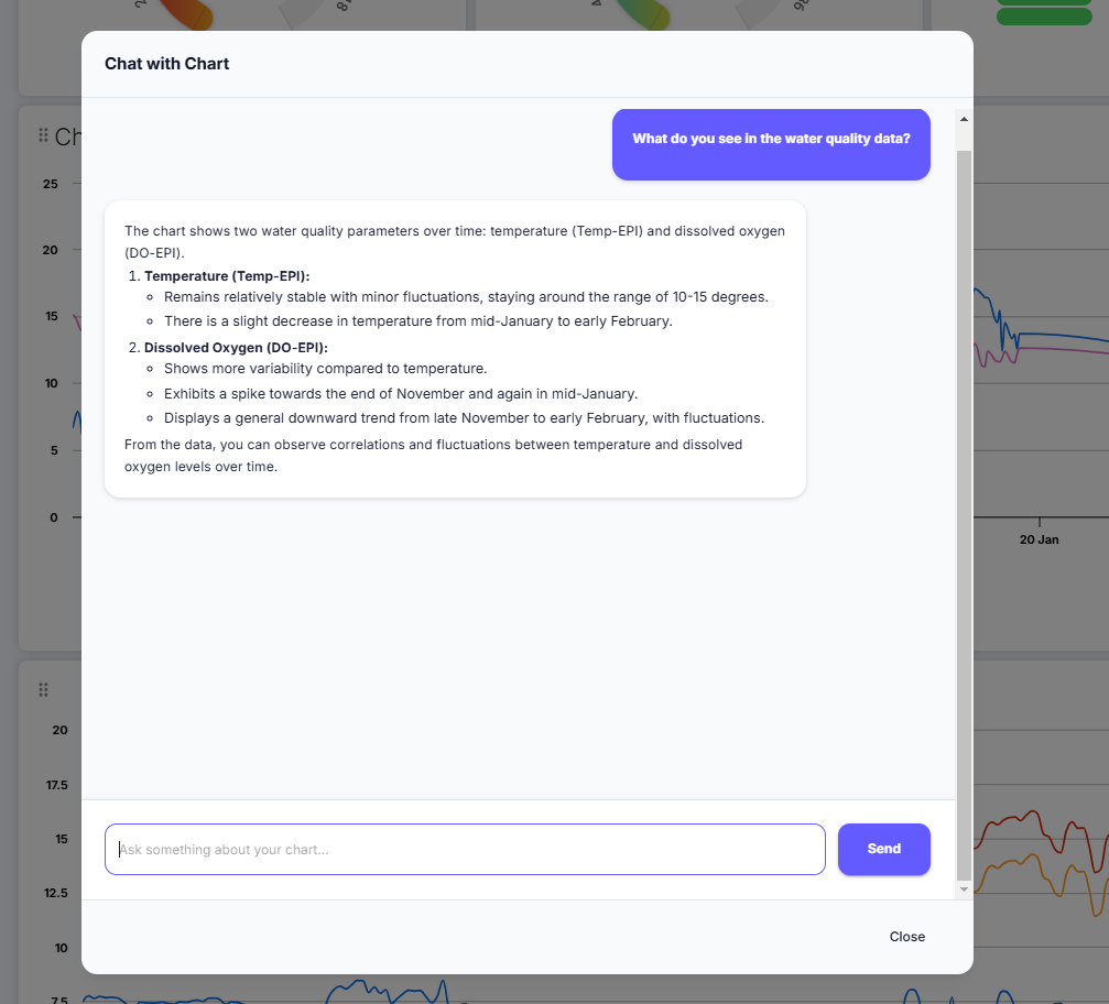 You can now ask questions about your water quality, whether it's about dissolved oxygen levels, temperature fluctuations, or other key metrics. The system will provide explanations and interpretations based on the data, helping you understand what’s happening in your lake. This feature makes it easier than ever to stay informed and take proactive steps toward maintaining optimal water quality.